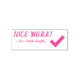 Den inspirerande utformningen av gummi frimärke har det motiverade feedbackmeddelandet "NICE WORK!" och en personlig lärare namn. Den har också en dekorativ bockmarkeringsikon. Det skulle kunna användas av en lärare, lärare eller en lärare när de markerar uppdrag för att erkänna att ett student har gjort bra ifrån sig.