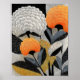 Denna urtagna blomstertrío med texturerade blad erbjuder en detaljerad illustration med tre runda kronbladiga blommor i mjukt vitt och varma orangefärger, var och en berikad med fina linjetexturer och djärva svarta centra. Omgivande blad i blått, gult och vitt visar intrikata linjära och prickiga mönster, alla satta mot en tät stjärnlik prickig svart bakgrund. Utformad i ett flexibelt format med 4:5 proportion, ger denna högupplösta digitala nedladdning lysande konstnärskap och hantverksskicklighet till alla utrymmen, perfekt för inramning, gåvor eller förhöjning av din heminredning med levande trädgårdselegans. #DigitalNedladdning #botaniskkonst #mön
