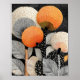 Dessa strålande strukturerade blommor mot en stjärnklar svart bakgrund utgör en slående abstrakt blomillustration med stora cirkulära blommor i varma orangea, krämiga och svarta nyanser, alla uppbyggda av fina strålande linjetexturer och prickade accenter. Avlånga blad med djärva linjära mönster reser sig mot ett tätt fält av vita prickar på djup svart, vilket skapar dramatisk kontrast och en modern grafisk estetik. Designad i ett flexibelt format med 4:5 proportion, ger denna högupplösta digitala nedladdning lysande konstnärskap och hantverksskicklighet till alla utrymmen, perfekt för inramning, som present eller för att förhöja din heminredning med levande trädgårdselegans.