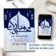 Capture the magic of an Eid night with this deep blue sky design. Featuring glowing mosque silhouettes and hanging white lanterns, this card creates a spiritual and celebratory atmosphere.