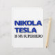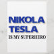 Nikola Tesla är min superhjälte. Textgrafik i svart och blå med vit blixt.