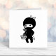 Söt seriefigur i ninjamaskerad iförd svart dräkt med undantag för ett litet band på huvudet. En traditionell japansk katana syns vara fastspänd vid hennes rygg. Flickan håller i en shoppingkorg.
