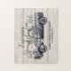 En underbar faaux sol blekt träbakgrund, klassisk land step-side vintage lastbil fylld med vackra vattenfärgblommor och sprejer av eukalyptus löv, och känslan "Enjoeing the ride with the bride and groom's namn and "fixed" date. Den här roligtens pussel gör perfekten nyfödd, husuppvärmning eller jubileumsgåva.