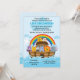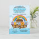 Noaks ark Baby Shower-inbjudningar med en båt full av söta djur. Designen har luddiga blå moln, vatten och en färgglad regnbåge. Använd vår enkla mall för att anpassa med dina festsdetaljer.