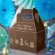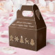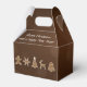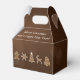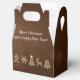 Elegant och utsökt julillustration: Dekorerad pepparkaksgubbe, snöflingor i brunt bröd, Julgran, brödrod, brödroppsrenar och brödringring med hälsning i God jul.