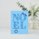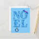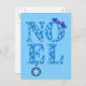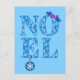 Vykort med "Noel" i hälsning, mönstrat med retromodernt Julgranar i isblått, förskönat med en hollissprit och en snöflingande ornament