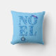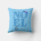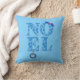 Kastkudde med hälsningen "Noel" mönstrad med retro-moderna julgranar i isblå nyanser, prydd med en liten gren av järnek och en snöflingaornament