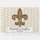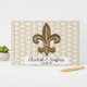 Gästboken bröllop med en stor gyllene loppur de lis-symbol och en mindre vit loppur de lis mönster över en neutralt beige-bakgrund färg. Det inkluderar parets namn.