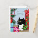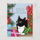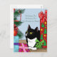 Svartvit katt som omges av julklappar som stirrar upp på prydnadarna på julgranen.