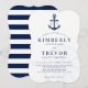 Unika bröllopsinbjudningar med en nautisk stil-design. På framsidan finns ett ankare med briden och triomens monogram på varje sida. På framsidan finns också en ljusblå kompass ro som sätter grund på inbjudan. På motsatt sida finns ett blått och vitt strimlat mönster som fyller nautiskt stil. Alla inslag är justerbara, så att roligten skapar och skapar den själv.