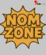 En djärv och lekfull tecknad-stil-design som innehåller frasen "Nom Zon" i skarpa, dynamiska bokstäver. Perfekt för mat älskare, snigelentusiaster och alla som vill föra humor och energi till stil.