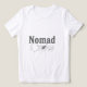 En vintageinspirerad illustration av en kråka med utsmyckad "Nomad"-text, perfekt för boho- och naturinspirerad klädsel. Denna vandrargrafik kombinerar minimalistisk djurkonst med retro-tatueringestetik för en unik statementbit.
