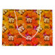 Atractivo patron en tonalidades calidas como el cafe, naranjo y ocres donde destaca un nomo y su escoba halloween para desear un feliz halloween