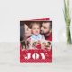 Det nordiska fotokollage julkortet har ett rött och vitt rättviseseknisk julsvett mönster med ord "JOY" i fet typografi och fyra av dina egna foton på framsidan och ditt namn, år och känslan "God jul!" inuti kortet. Enkel att anpassa med egna foton, namn och även med hälsning.