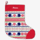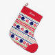 The repeated pattern on this colorful Christmas Nordic sweater style Holiday stocking is a silhouette football helmut among snowflakes, trees, and geometric designs. Colors include navy blue, bright Holiday green, and red, all on a white background. A matching red top border holds her name in white script, and there's a toe patch, too. Fun for anyone who loves football!