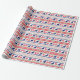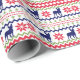 The repeated pattern on this colorful Christmas Nordic sweater style gift wrapping paper is a silhouette French Bulldog among snowflakes, trees, and geometric designs. Colors include navy blue, bright Holiday green, and red, all on a white background.