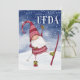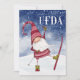 Få julstämning med detta söta akvarellkort med en röd och vit nordisk tomte som försöker hålla balansen på sina skidstavar. Det finns vit text som säger "Ufda". Baksidan har ett rött och vitt Fair Isle-mönster med en julstjärna i hörnet. Du kan anpassa med namn och år.