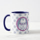 Här är en söt personlig jul mugg som både barn och vuxnor kan njuta av. På ena sidan finns en vidsträckt nordisk bild av snögubbe i stil i mitten av en blå grått-bakgrund som är inramad i matchande lavendel rosa. Den andra sidan har polar på samma banderoll. Den inramade bilderna placeras sedan på en passande blå och vit snöflingerbakgrund, med anpassningsbarna i marint blått mellan bilder.