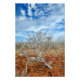 Landskapet Nordsjön, en del av Galápagosöarna Archipiélago. Den rostiga röda stenen runt den sol-blekta vita träd, som pekar uppåt till blå himmel.