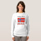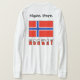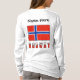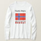 Röda bokstäver med tak över snö läser NORGE under denna norska Flagga med röd bakgrund och mörk blått skandinaviska eller nordiska Kor. Ovanför är ett ställe som lägger till ditt namn för att anpassa ditt utseende. Eller lägg till någon annans namn för en anpassad gåva. Personlig, långärmad kvinnors t-shirt är underbar för norska familjeåterföreningar.