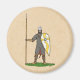 Kläder i knä- och näshållor, med en stålspaltlans och en drakformad sköld, verkar en avmonterad nordisk riddare på cirka 1066 redo att erövra medeltida England i detta originalillustration av Richard H. Fay.