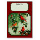 Ett par manliga och hona norrut kardinaler i ett holly träd, medan en tredje kardinal sitter på ett träträ av basket fyllt med nyplockat grovt löv och bär. Allt på en festlig helgdag röd bakgrund. Bilden skapades från en ursprunglig oljemålning av Crista Forest.
