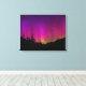 Ett vackert nattlandskap. Bergsområdena och träd framstår som en svart silhuett mot en ljus och levande visning av norra ljus som skakar ovan. Den spännande natten i himlar glöms i rosa, lila och gult.