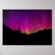 Ett vackert nattlandskap. Bergsområdena och träd framstår som en svart silhuett mot en ljus och levande visning av norra ljus som skakar ovan. Den spännande natten i himlar glöms i rosa, lila och gult.