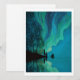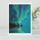 Frakt och två vid en klippig strandlinje, norra Ljus Aurora Borealis i himmel. Generativ konst inspirerad av skandinaviska och nordamerikanska landskap. Underbart Sjöar, Norge, Sverige, Kanada, Arktis, Island.