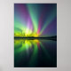 En andningsfull visning i norra ljus över ett stillastående sjö, som reflekterar vibrerande grönt och lila i himmel nattetid.
