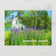 Fotografi av ett vitt hus och lila blommor i en vild blomma på Kjerringoy, en ö i norra Norgen, norr om Arktiska cirkeln. Jag tog det här fotot när jag var på cykeltur runt området.