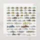 Detta är en representation av sötvattensfiskarter som är inhemska i Nordamerika. Rad 1 Rekära Sunfish, Warmouth Sunfish, Grönt Sunfish, Longear Sunfish, Bluegill Sunfish, Sten Bass, Northern Sunfish Row 2: Pumpkinseed Sunfish, Orange Spoted Sunfish, Redbrös Sunfish, Black Crappie, White Crappie, Shadow Bass Row 3: Black Soted Sunfish, Redsked Sunfish, Black Banded Sunfish, Dollar Sunfish, Ozark Bass, Bantam Sunfish, Sacramento Perch Row 4: Flyer Sunfish, Roanoke Bass, Blue Spoted Sunfish, Banded Sunfish, Shoal Bass, Guadaloupe Bass Row 5: Smallmouth Bass, Suwannee Bass, Largemouth Bass, Redeye Bass, Spoted Bass Row 6: Striped Bass, White Bass, White Perch, Gult Bass, Walleye, Gult Perch Row 7: Pickeral, Northern Pike, Muskie, Rainbow Smelt Row 8: Blue Catfish, Channel Catfish, Flathead Catfish, White Catfish Row 9: Black Bullhead, Brown Bullhead, Gult Bullhead, Freshwater Drum, Humpback Chub, Northern Pikeminnow Row 10 Bull Shark, American Paddlefish, Alligator Gar Row 11: Goldeye, Bowfin, Texas Cichlid, American Shad, River Carpsucker, Burbot