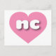Det här vykortet har ett pulserande rosa hjärta som innehåller det feta vita, rundade nedre fodral brev nc, en lekfull förkortning för North Carolina, tjärhälsoläget. Baksidan av vykortet är tom och väntar på din anpassade text eller dina handskrivna känslor.