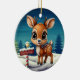 Unique north pole reindeer ceramic ornament featuring a Christmas scene with cute baby forest animal deer with antlers in a cartoon graphic art style, standing in the foreground. Background includes wintry night Xmas trees and white winter snow landscape, completing the holiday season charm of this woodland wildlife doe character illustration decor, making a great gift. Fawn lover design on front and back. No matter how the decoration turns, it always looks festive and complete. 🎄🩌 Dimensions: Diameter: 2.87". Thickness: 0.156". Weight: 1.4 oz. Made of white porcelain. Full-color, full-bleed printing. Included gold thread does not come attached/tied.