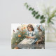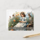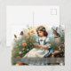 En ung flicka i en blå klänning med vita fläckar sitter på en träbänk mitten i en blommar trädgård. Hon läser ett litet kort medan fjärilar flyger runt henne. En hare och en liten kanin sitter bredvid henne, medan andra vår blommor blommar i varmt färg i bakgrunden. Ord "Glad påsk" ge bild en festlig röra.