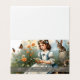 En ung flicka i en blå klänning med vita fläckar sitter på en träbänk mitten i en blommar trädgård. Hon läser ett litet kort medan fjärilar flyger runt henne. En hare och en liten kanin sitter bredvid henne, medan andra vår blommor blommar i varmt färg i bakgrunden. Ord "Glad påsk" ge bild en festlig röra.