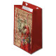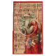 Nostalgiska Santa i det långa röda laget som bär en snö, täckte det små vintergröna träd tillsammans med raddaleksaker. Bak är ett biet av notblad. Andra tillgängliga matcha objekt