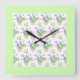 En söt väggklocka, med mönster av rosa ros, gräddvit Mock Orange Blommar och lila Lavender, i ett ljust grönt blommigt, från en handmålad vattenfärgsdesign av Judy Adamson.