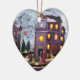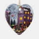 Denna vackra hjärtformade keramiska prydnadsföremål har en gammaldags scen av en belyst byn Victorian stil mot en snöbakgrund. Fint som gåva, eller att hänga på träd.