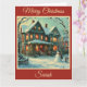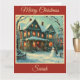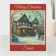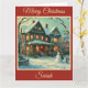 En charmerande nostalgisk scen i snögubbe framför ett hus som dekorerats till jul. Lägg till egen personlig.