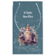 Nostalgiskt och Luxurious Merry Cristmas-presentväska. Illustration av exklusiv parfym omges av dansande snö kristaller. En lyxig presentpåse för den speciella gåvan. Anpassa med ditt textval både fram och tillbaka. Ha ett nostalgiskt God jul. Finns i olika färg, storlekar och avslutar. Här är en tealpresentpåse färg.