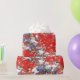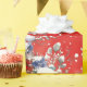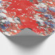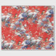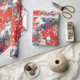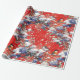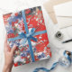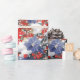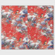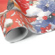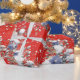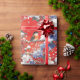 Nostalgiskt festivt emballage pappert med ett mönster av fåglar och snönära grenar på en ljusröd bakgrund.