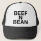 BEEF N BEAN-roligt och ironisk slogan på truckerkeps, svart, lustigt typografiskt påstående, inspirerat av TV-komedisande karaktär frank rossitano. bönor och nötkött, biböna. originell och smakfull.