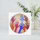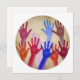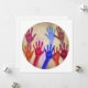 Bräckt, färglöst händer når uppåt, överlappande i skuggor från rött till blått. Det arrangemanga skapar en dynamisk känsla av rörelse och enighet.