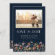 Blått, modernt fotofoto Boho sparar datumet. Den här snyggten & elegant bröllop sparar datumen med vackra, handmålade vildblommor som ordnats som en underbar bouquet-perfekt för vår, sommar eller fallbröllop. Sök efter matchande objekt i samlingen Navy Blue Boho Wildblomma Bröllop.
