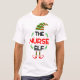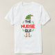 Den här bilden har en vit t-shirt med jultema. Texten "NURSE ELF" visas med festive red och grönt lettering, omgiven av en andedräkt av grönt löv. Ovanför texten finns en stripe-hatt, och nedanför är halvskor med böjda leksaker, som skapar en lekfull och glad helgdag.