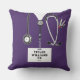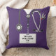 Kreativets sjuksköterskekudde med lila sjukhusskrubar, ett stetoskop och en schweizisk armé knivar. Redigera text om du vill lägga till autentiseringsuppgifter för namn och professionell.