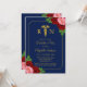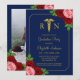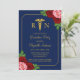 Nurse graduation with pink and red roses against a navy blue background. Gold caduceus and script typography. Photo template via Pixabay licensed under CC0 and must be replaced with your own photo.