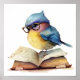 Den lilla blåa och gult fågeln med glasögon och läsning av bok. Underbar för att uppmuntra ditt barn att läsa. Det skulle också vara en bra gåva till en lärare i klassrummet. Kvadratisk yngeldekorg 12 tum x 12 tum. AI-assisterad grafik som köpts med kommersiell licens. Bild: MokoDE