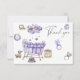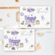 Inbjudan visar vattenfärg i en baby-vagga, en yngelmobil i form av lila runt moln, barns leksak: en elefant för gnagare, en anka på hjul, en nalle, en bunny, en bib, en nappar, en pyramid.